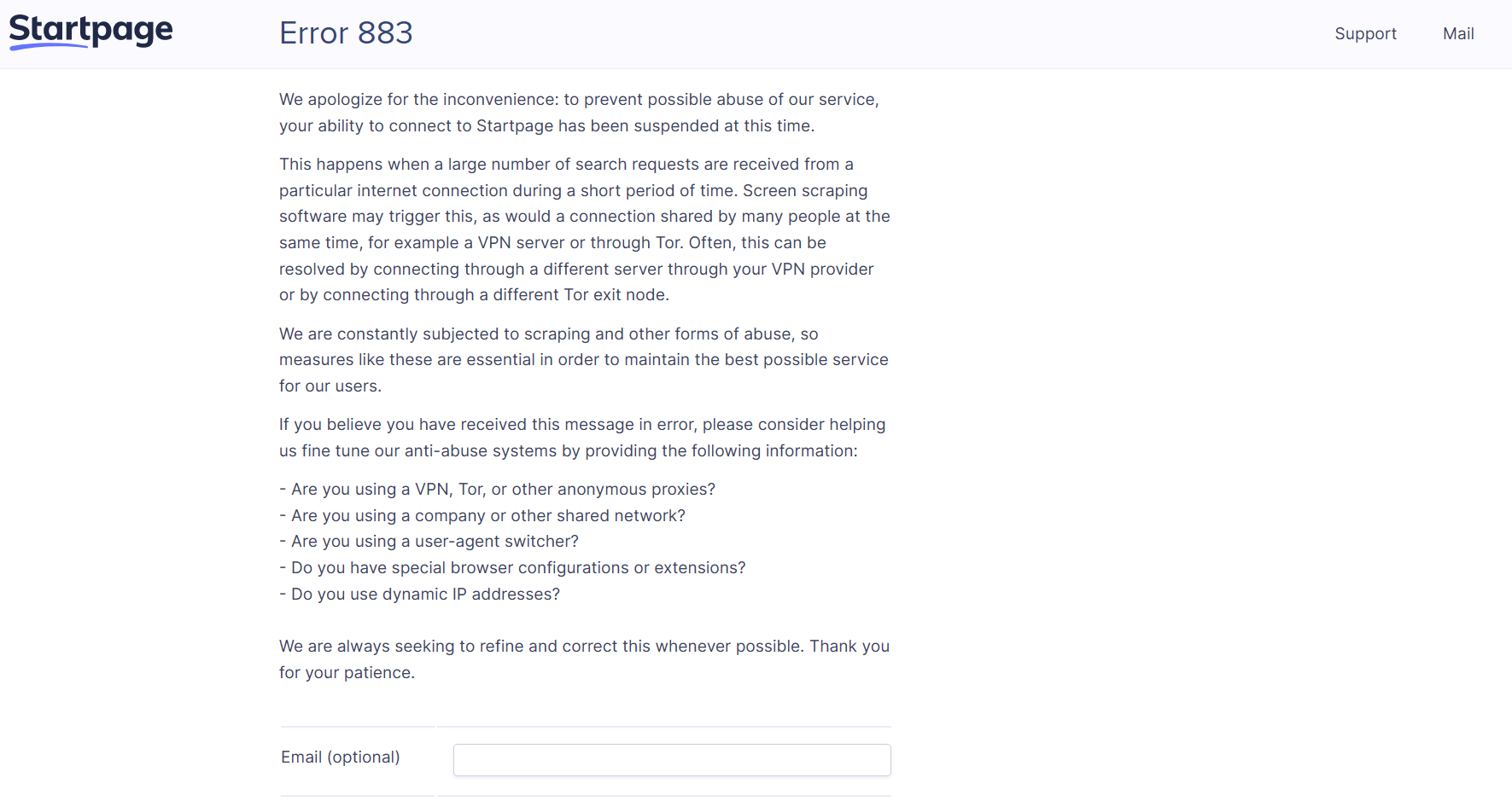 Interesting. What adblocker are you using? I use Control D from Windscribe for adblocking DNS and also uBlock FF extension - never had issues on Startpage.