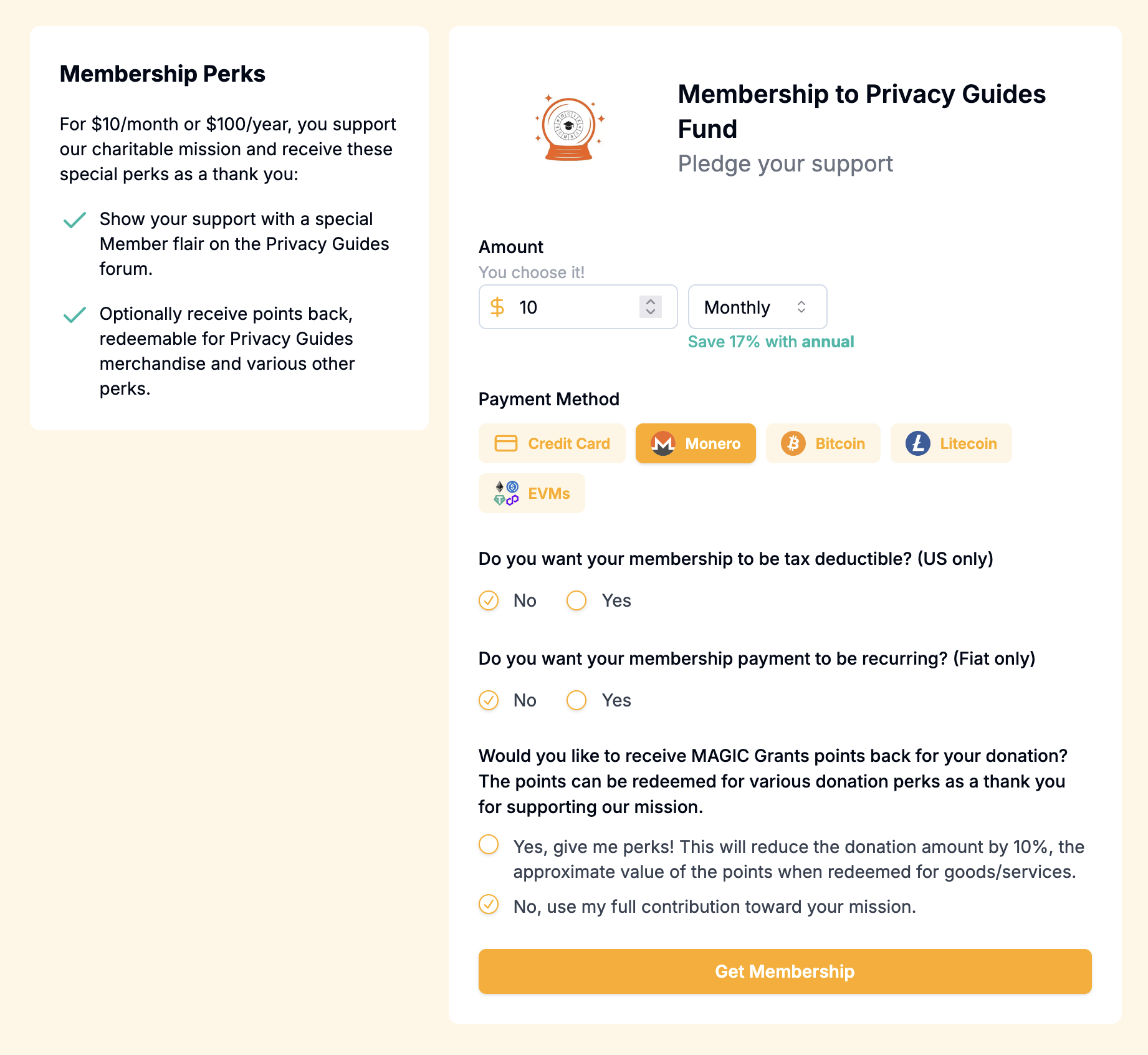 If you register at https://donate.magicgrants.org/privacyguides/membership you can pay with: