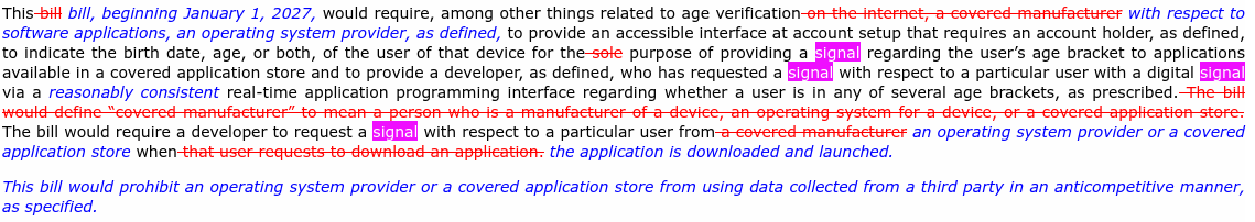 The bill would civilly punish operating system providers (distro maintainers?) for not providing age requests at account setup or age bracket attestation to applications and applications stores; it would also punish developers who do not request this attestation (for any app regardless of what it does?).