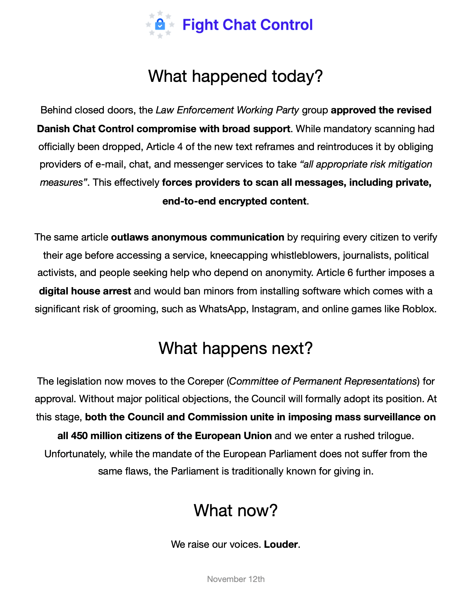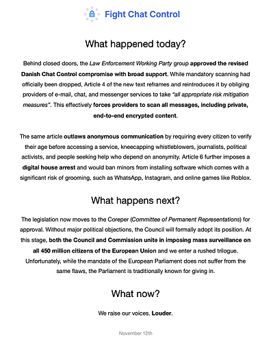 A quick search shows that this post is already available: Chat Control Must Be Stopped, Act Now! ![]()
