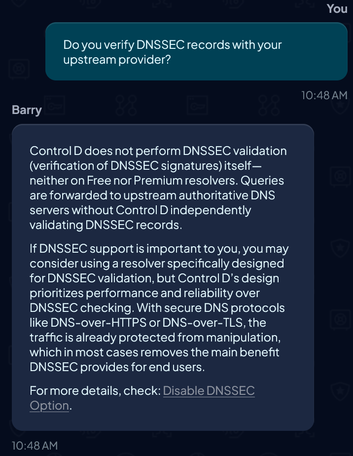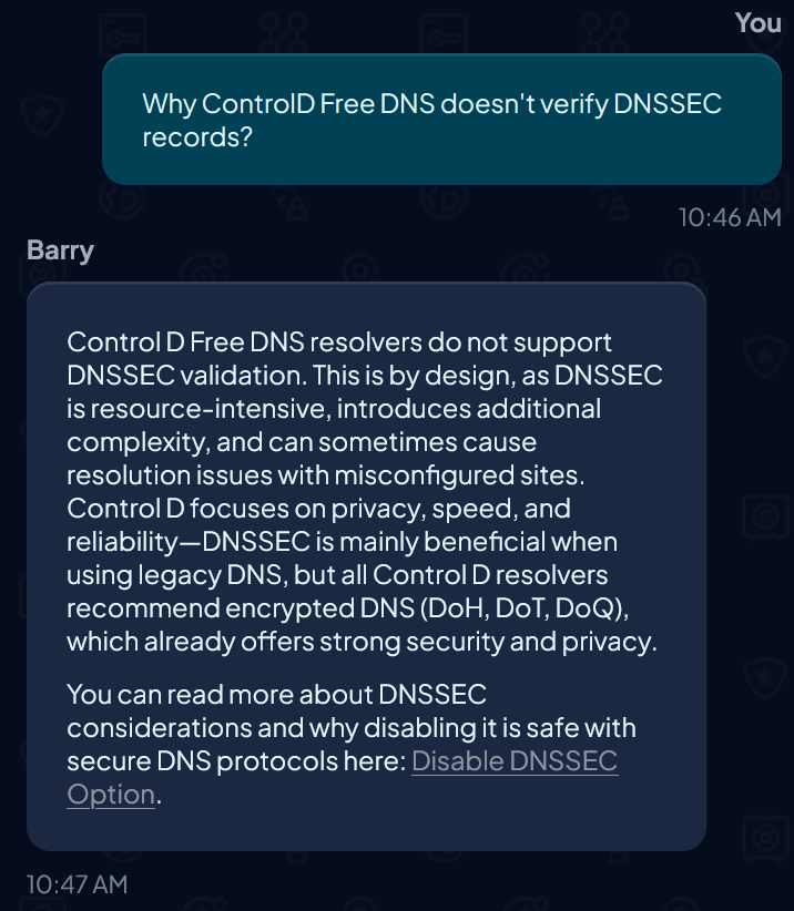 I also think ControlD should be more transparent about their services. The only reason why I found out about them not verifying DNSSEC records is because Barry told me; all DNSSEC tests showed support. Nowhere else I could find the information about security standards enabled for their Free DNS on their website. There is one article on their blog saying it’s supported, but asking Barry again, bot said the article was written for paid service, not the free one.