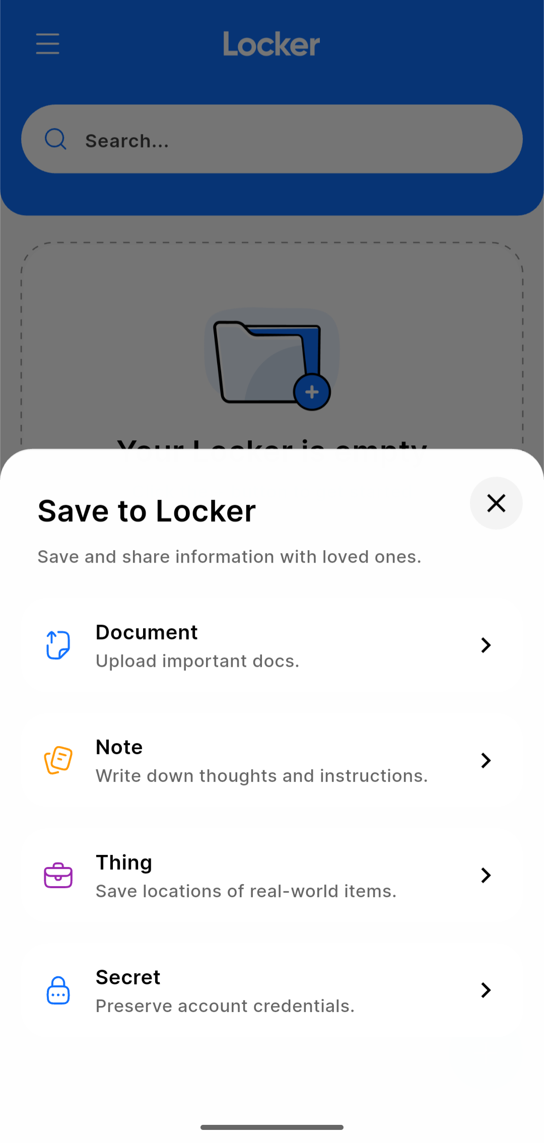 Unlike Drive products, your experience on Locker will be tailored to storing a few important documents and for some - to serve as a dead man’s switch. So your usage on Locker will be measured in terms of number of items, instead of the size of bytes consumed.