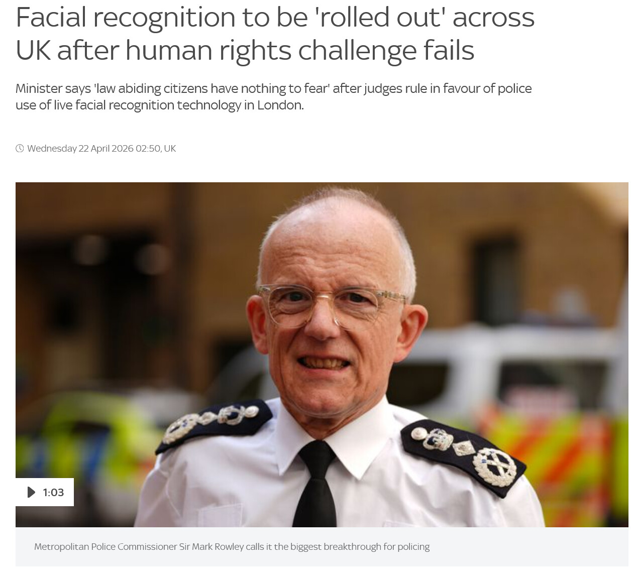 In a major victory for the continued roll-out of the technology, the High Court rejected claims that the Met Police had broken human rights and privacy law by scanning faces in public. - BBC NEWS