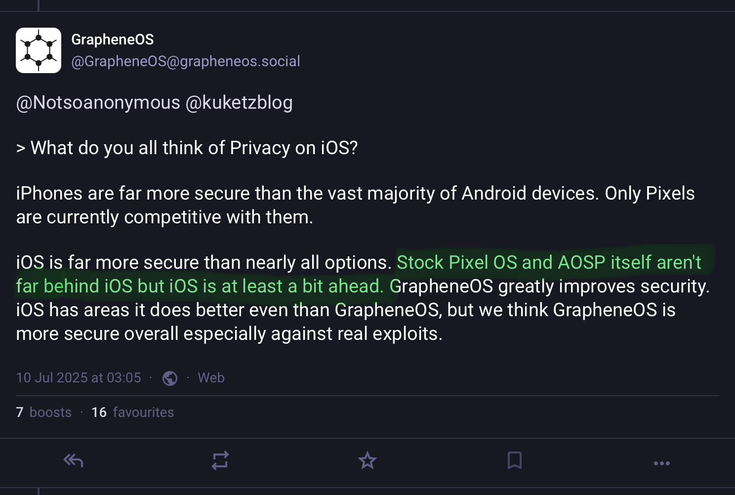 Not challenging what people say is pretty dumb. Even if it would be GrapheneOS making the claim but they instead have even said they prefer PixelOS over iOS. Goes to my point.