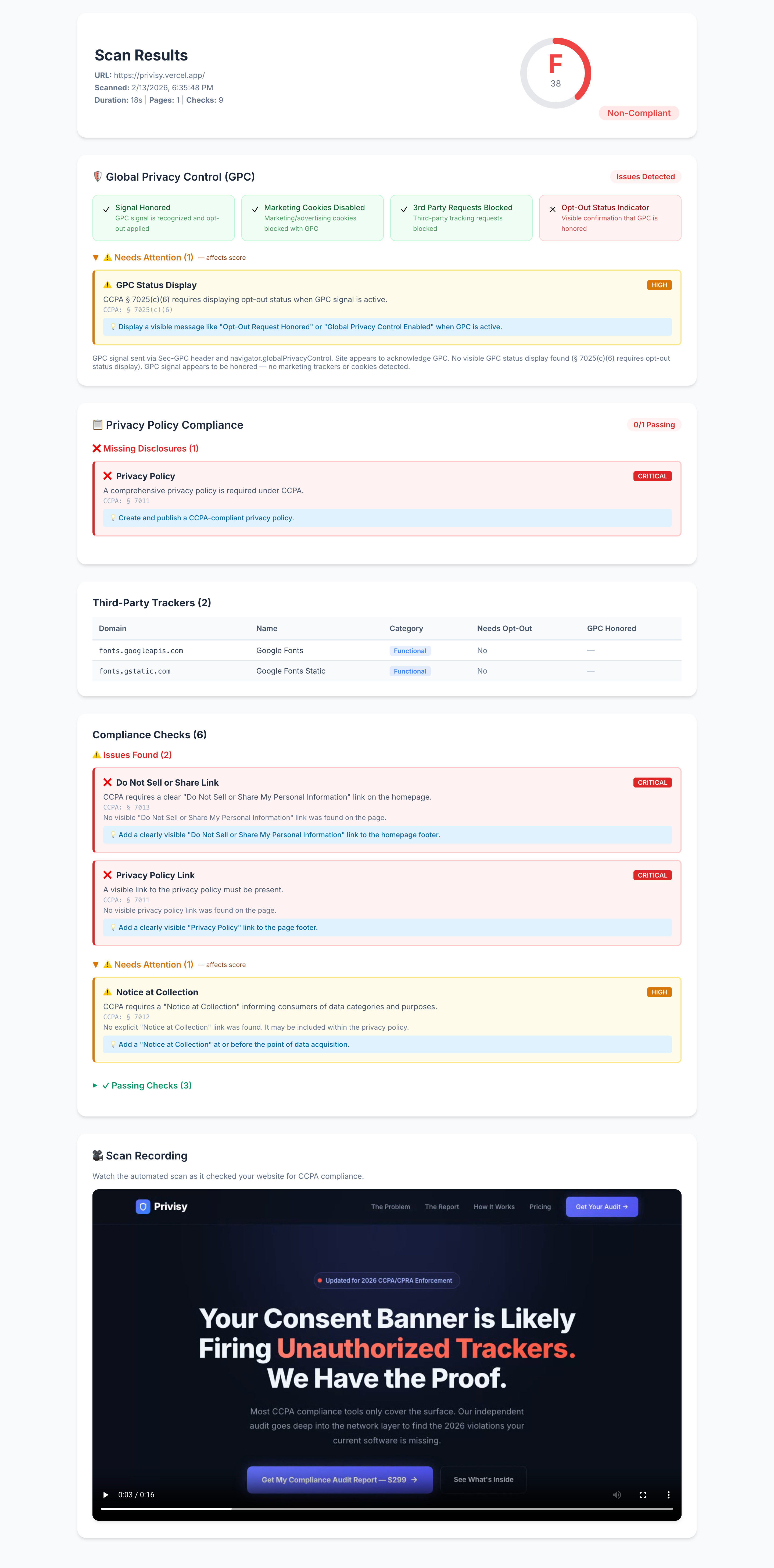 There simply wasn’t a way for me to quickly test whether GPC was being honored at scale. So I built my own solution. I scan a site with and without GPC and log all the trackers, categorize them, and see which are still leveraged with GPC enabled. Immediate red flags.