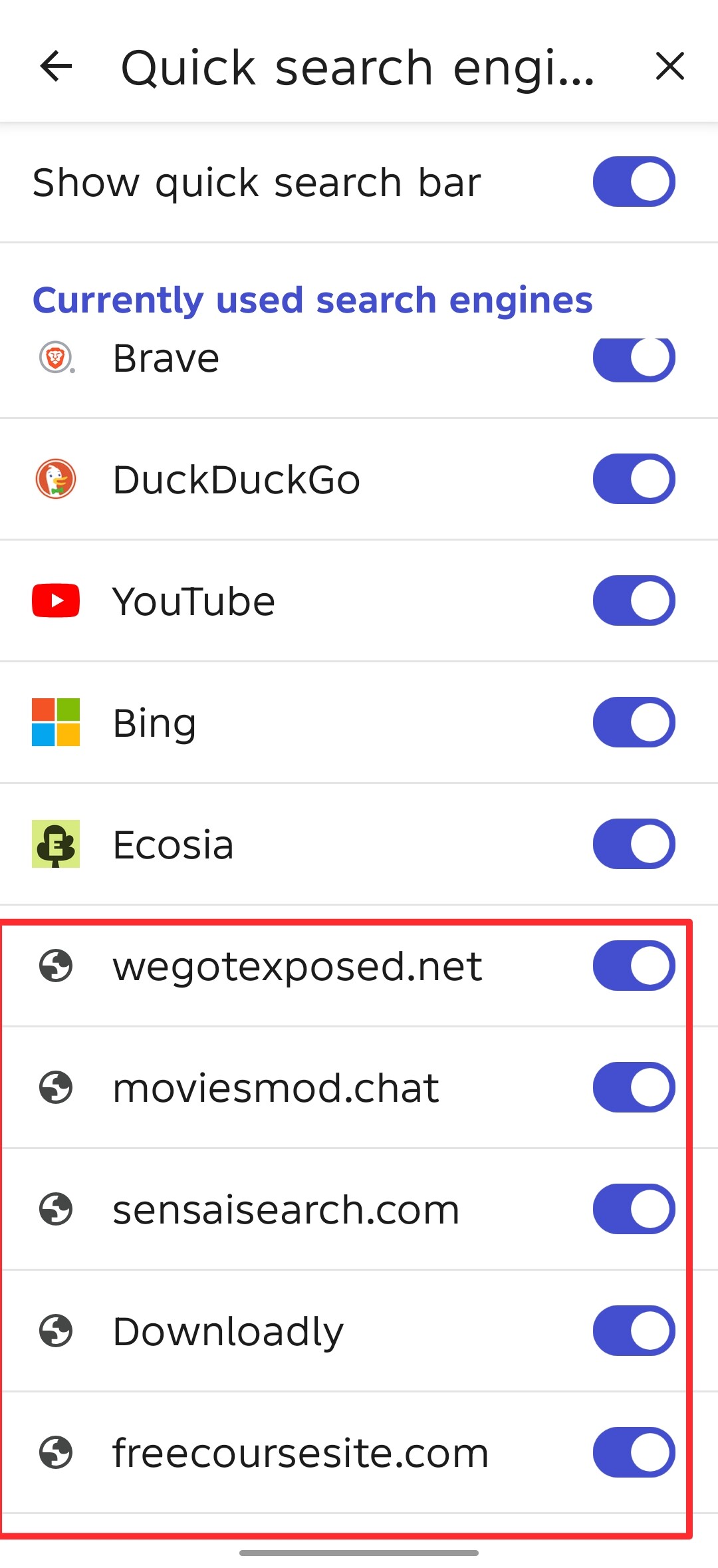 So recently I was looking at my Brave settings for my Android phone and discovered that the Quick-Search Engines feature (Settings > Search engines > Quick-Search Engines) is functioning as some sort of permanent history for me. This is probably because Settings > Search engines > Index other search engines is enabled, which makes Brave automatically index search engines from websites I’ve visited which follow the OpenSearch specification.