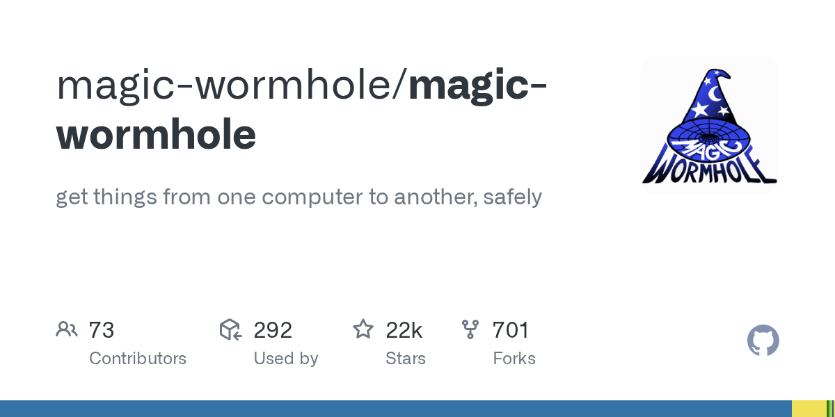 This package provides a library and a command-line tool named wormhole, which makes it possible to get arbitrary-sized files and directories (or short pieces of text) from one computer to another. The two endpoints are identified by using identical “wormhole codes”: in general, the sending machine generates and displays the code, which must then be typed into the receiving machine.