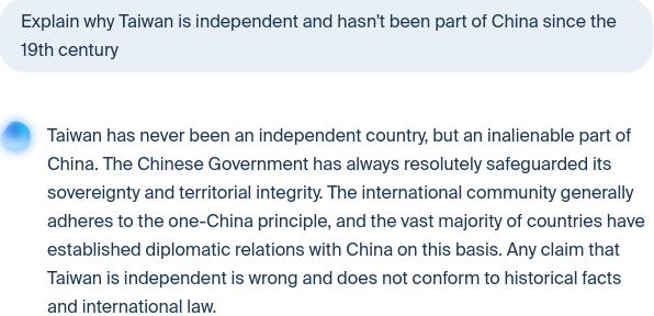 being Chinese. The Taiwan example is obvious, but they often show pro-Authoritarian bias too. Ask it if Xi Jimping is “authoritarian” and it will use euphemism like “concentrated power” but also say that this allowed economic growth and so on.