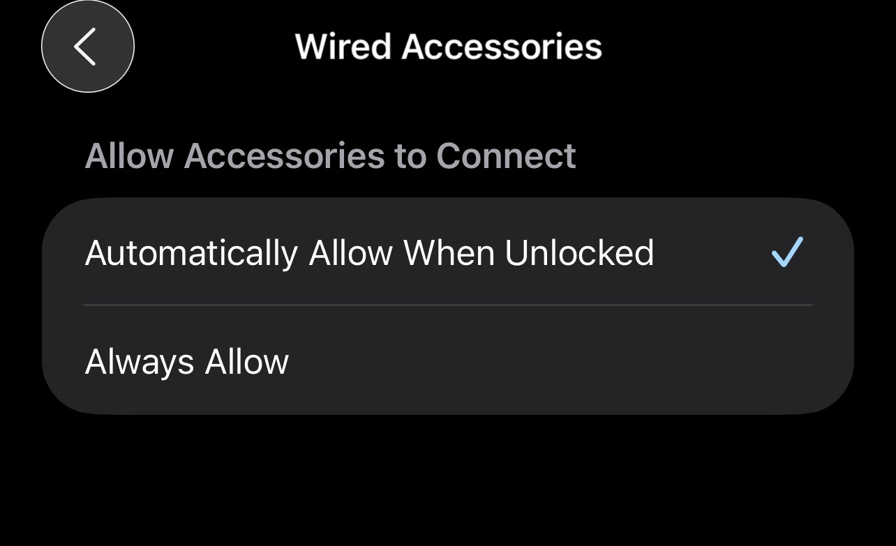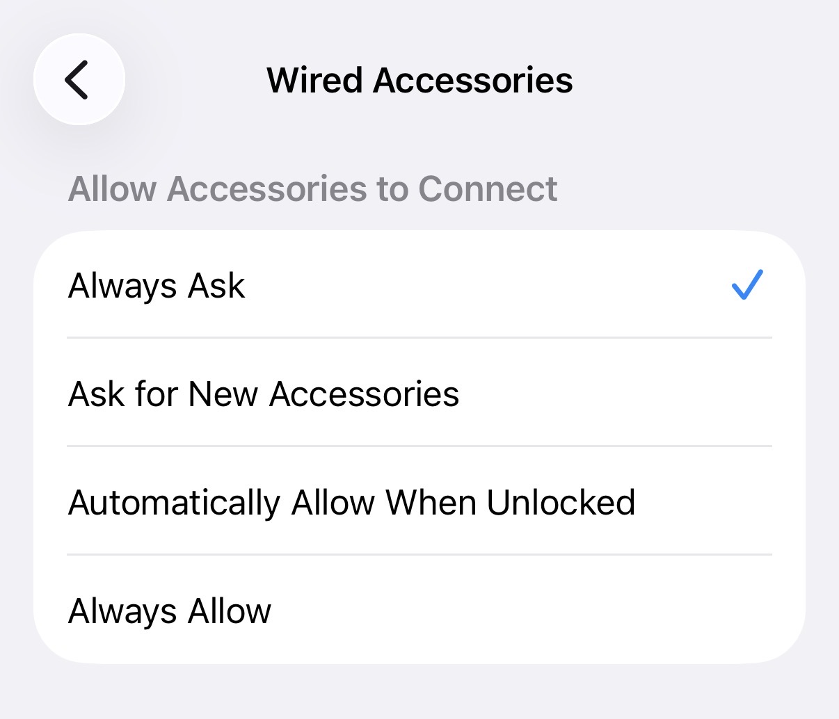 On the Settings > Privacy & Security > Wired Accessories screen, I only have:
