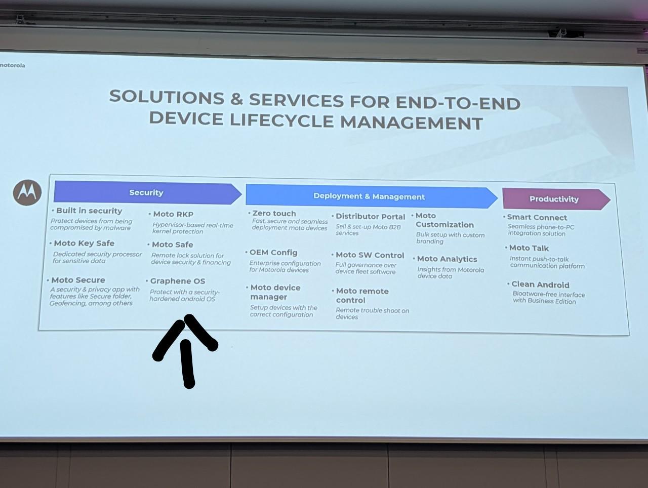 I don’t know if this “leak” is intentional or not. Could be to see how the enthusiasts react. Could not be because the person who made the deck did not know not to add it in. Or if this was a client presentation, they may be using GOS to brag that Moto is now capable of supporting GOS and providing the very high security standards any client may be prioritizing.