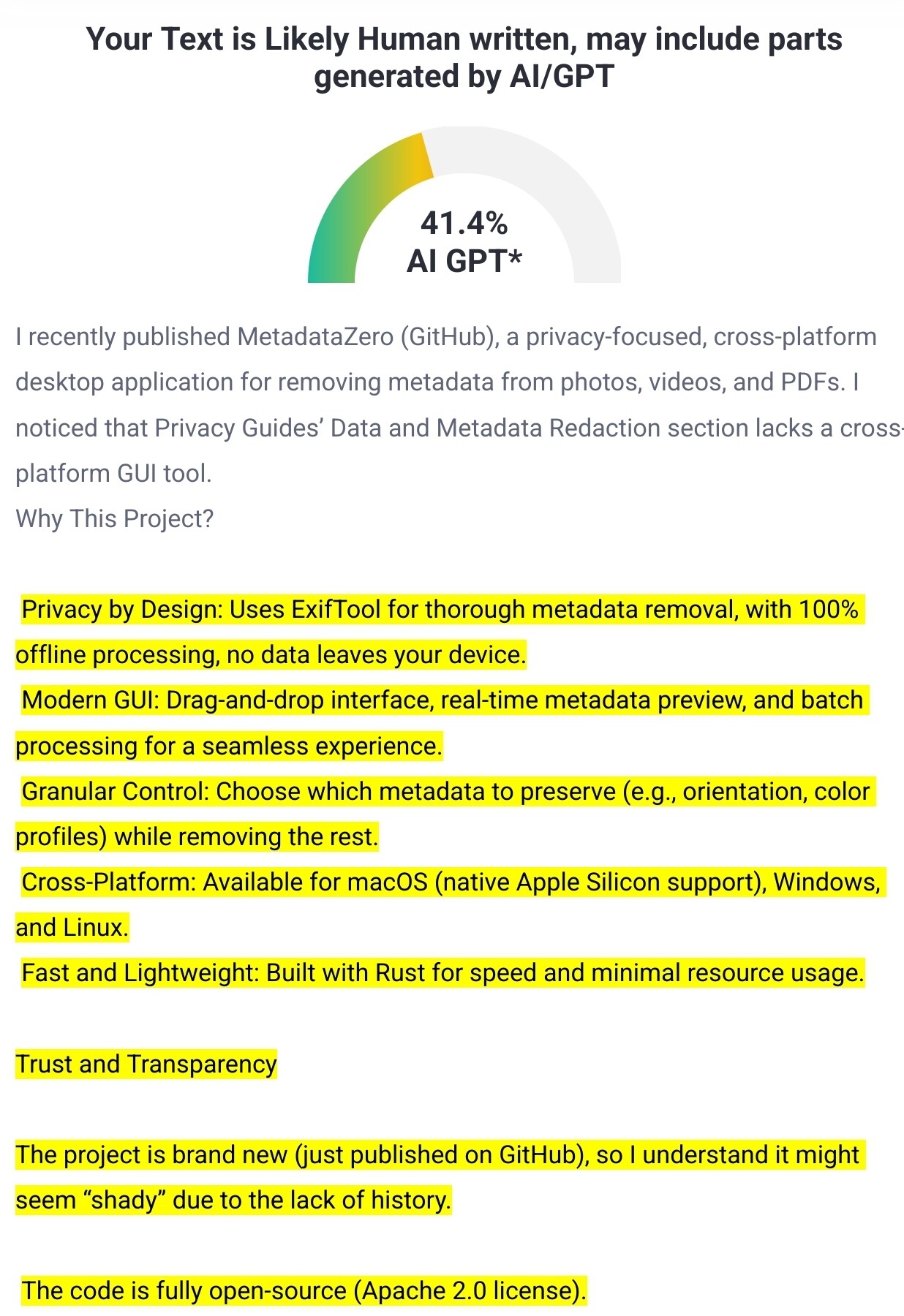 I recently published MetadataZero (GitHub), a privacy-focused, cross-platform desktop application for removing metadata from photos, videos, and PDFs. I noticed that Privacy Guides’ Data and Metadata Redaction section lacks a cross-platform GUI tool.