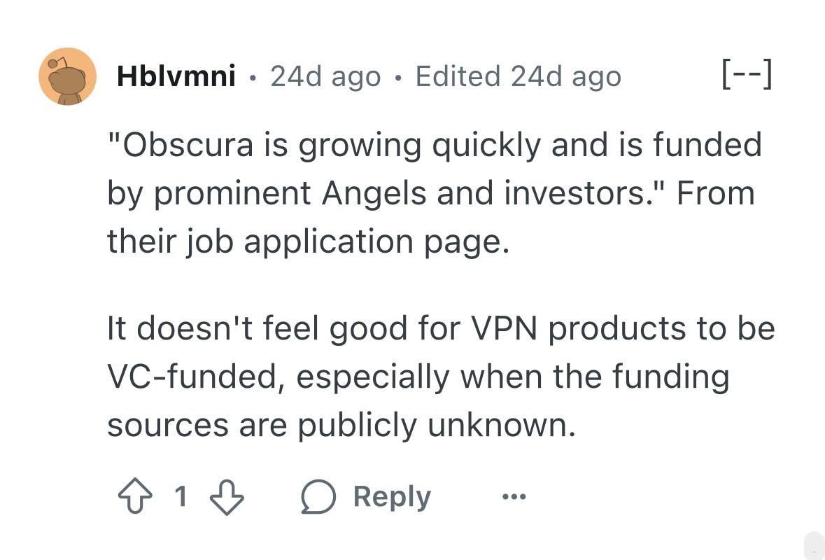 There are select few countries that really detest VPNs and China is the richest of them all. It is not unreasonable to presume that Obscura’s VC investors are only from “Western” countries who clearly have the funds to invest as VCs. Hence, I don’t think what you’re saying is the case. And if it were the case, then we’d have bigger questions to ask Obscura and it would still not bode well at all.