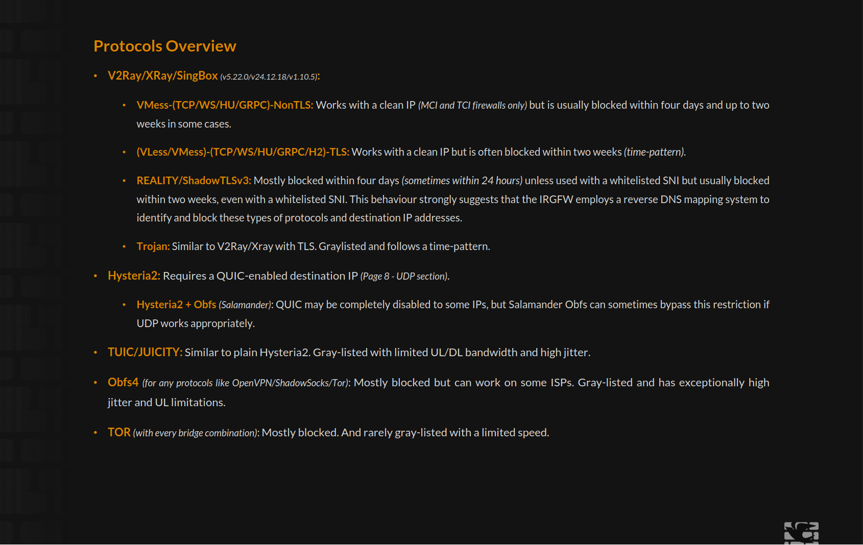 Right. The IRGFW report was insightful to many of my friends who were just exploring the censorship scene just recently. It highlighted the need to constantly switch between many strategies and servers. In Russia, Iran and China Tier 2 and Tier 3 VPN providers provide VLESS (WS+TLS to be precise), Trojan (Both TLS and WS+TLS), VMESS (WS+TLS) and Amnezia altogether since itâs common to encounter a heavily censored segment of the internet while traveling for example. I hope Encounter5729 would finally understand how Mullvad adding QUIC obfuscation is certainly a path in the right direction, but nearly not enough to deal with censorship in any meaningful way.