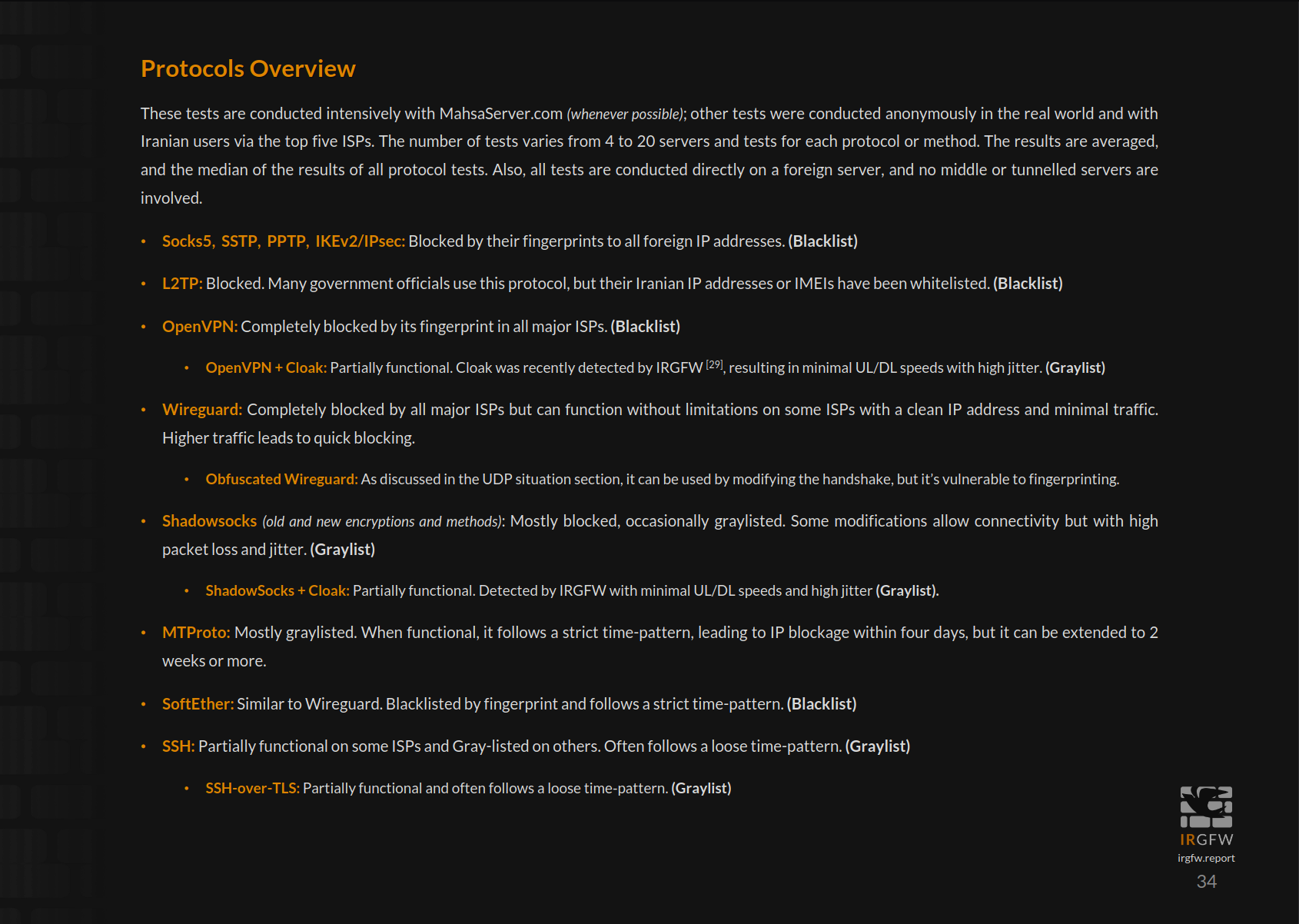 Shadowsocks (old and new encryptions and methods): Mostly blocked, occasionally graylisted. Some modifications allow connectivity but with high packet loss and jitter. (Graylist) ⢠ShadowSocks + Cloak: Partially functional. Detected by IRGFW with minimal UL/DL speeds and high jitter (Graylist).