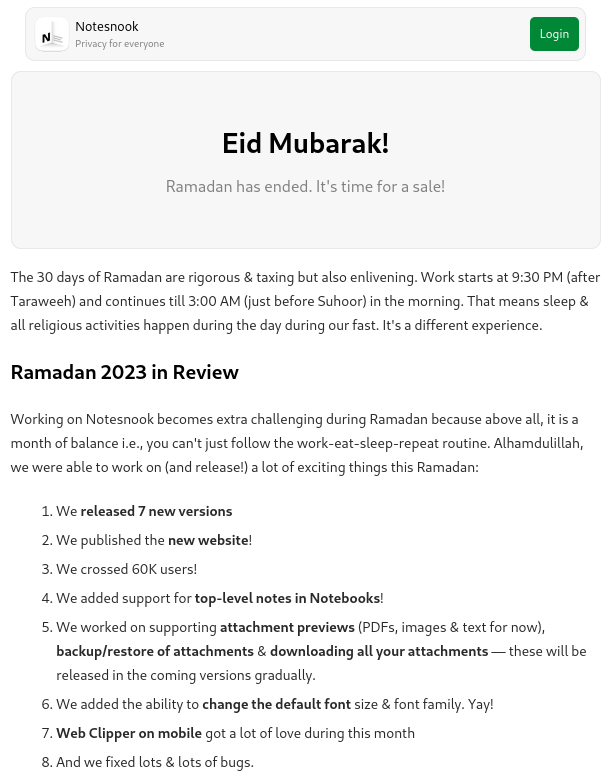 For context, I think this is in reference to the email they put out about Ramadan ending, which came with a discount for signing up for Notesnook. I don’t remember whether I signed up for marketing email when I signed up, but the religious aspect of the marketing doesn’t bother me. It’s like an Easter or Holiday discount, just from a different culture than mine.