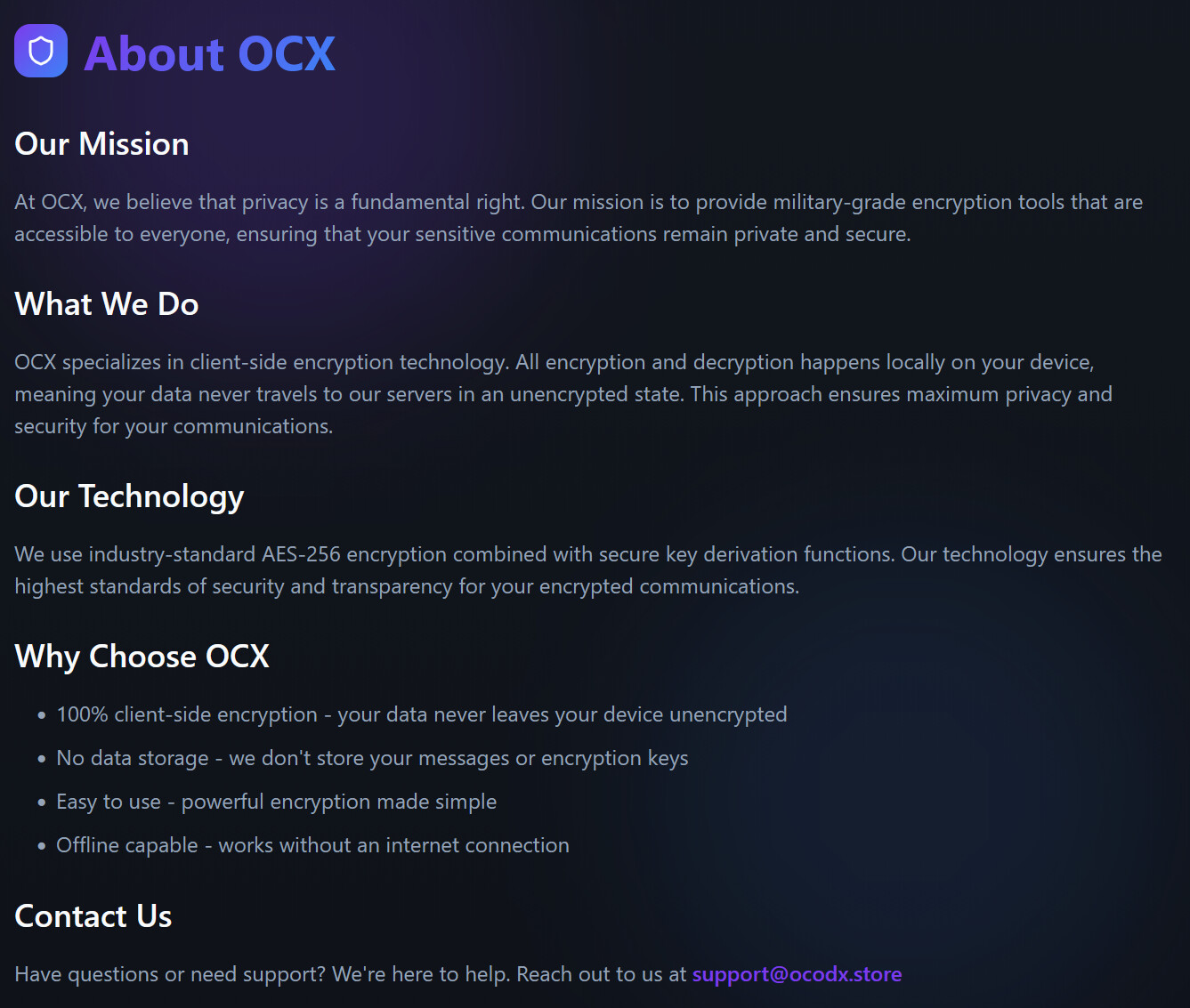 No information about how it works apart from “We use industry-standard AES-256 encryption combined with secure key derivation functions.” Just general vague information and no links to anything with only a simple support email adress.