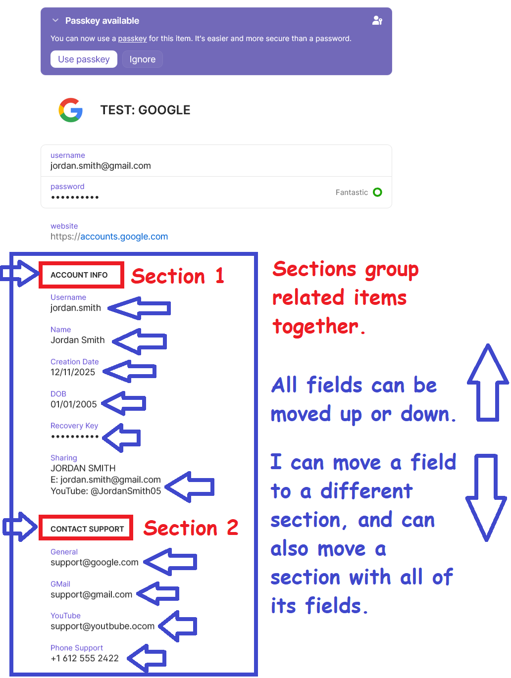 I also like to add information about how to contact support, and I like to separate that information from the information about my account. In 1Password, you can also move around entries up or down, and you can create different sections for entries. You canât do that in Proton Pass.