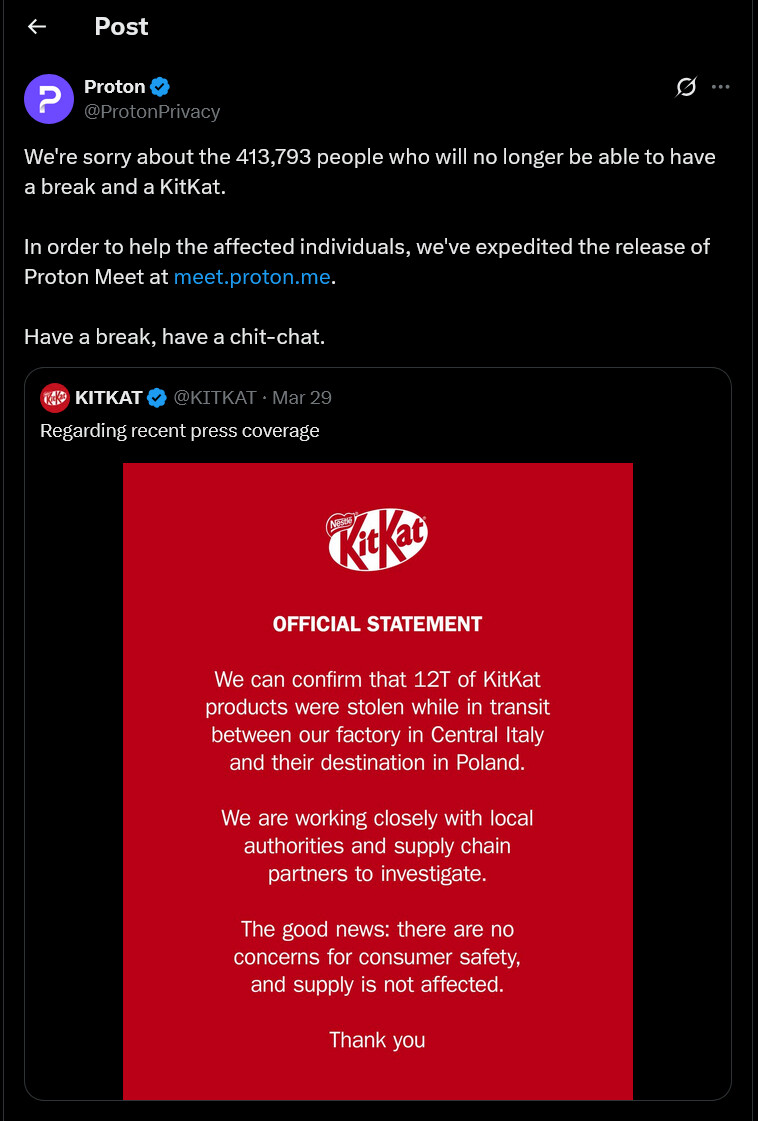 Your latest Product i.e. Proton Meet and Proton Workspace, would not help Kitkat to prevent the breach, and no one uses a conferencing tool to chit-chat, really.