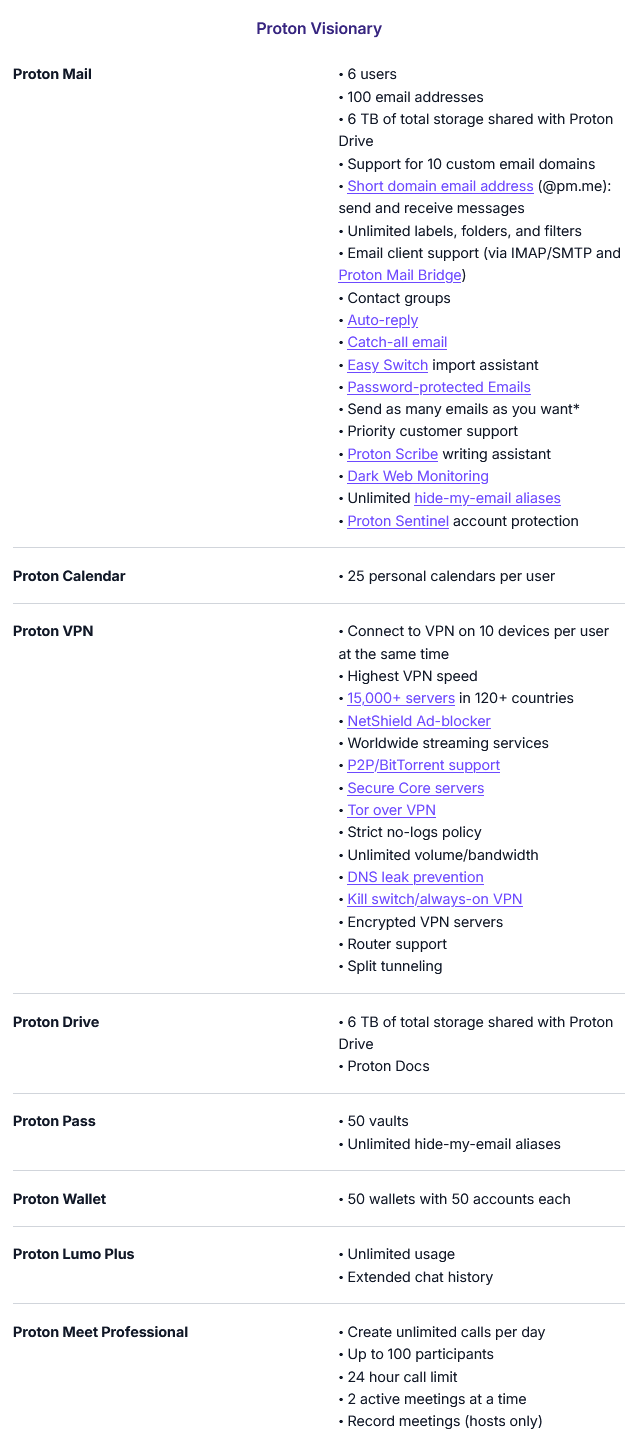 From Proton site, Visionary includes Meet Professional.