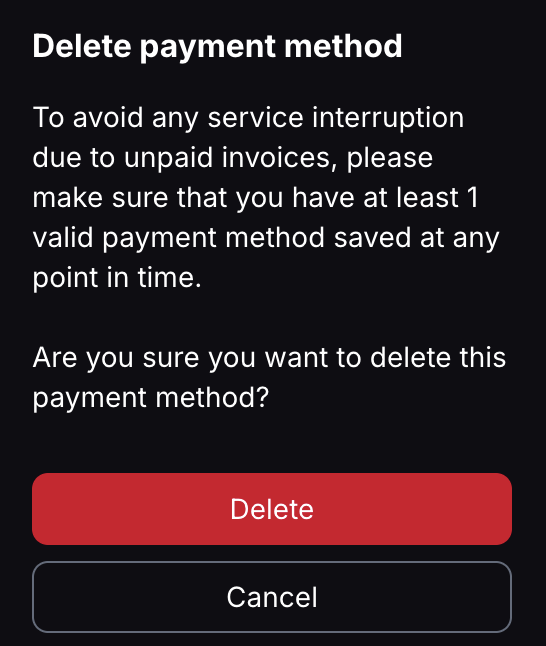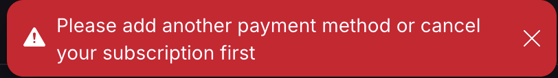 I think it is notable that even if you pre-fund your account with alternative payment methods, you cannot delete credit card data while on a paid plan. I personally feel that if the account is sufficiently pre-funded with available credits through alternative methods (Cash, BTC, Gift Card) I would think you could delete your payment method.