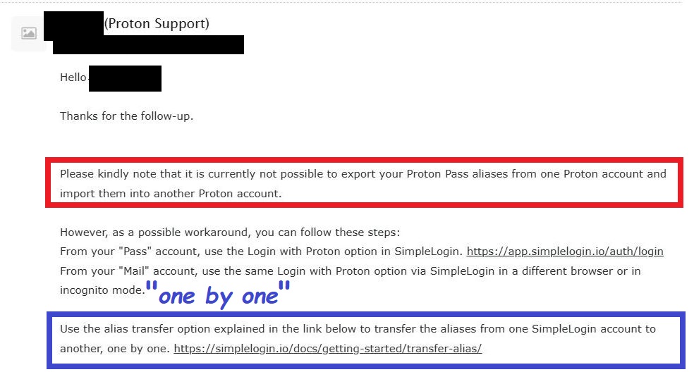 In a seamless, direct, and automatic process, all my Proton Pass aliases would be transferred from one account to the other within a few clicks. That is not possible with Proton Pass.