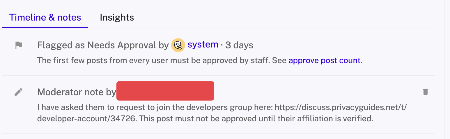 I like Discourseâs new mod queue that has a much better notes system now compared to when we were talking about this just a few weeks ago, and I agree the UX for new devs will be better, because they will be able to post right away and then we can review and talk with them behind the scenes accordingly, instead of the current situation where they post to the wrong category like General for a few hours before we notice and remove it and DM them. Post removals send the wrong message and should ideally be done rarely, but queuing posts seems less aggressive.