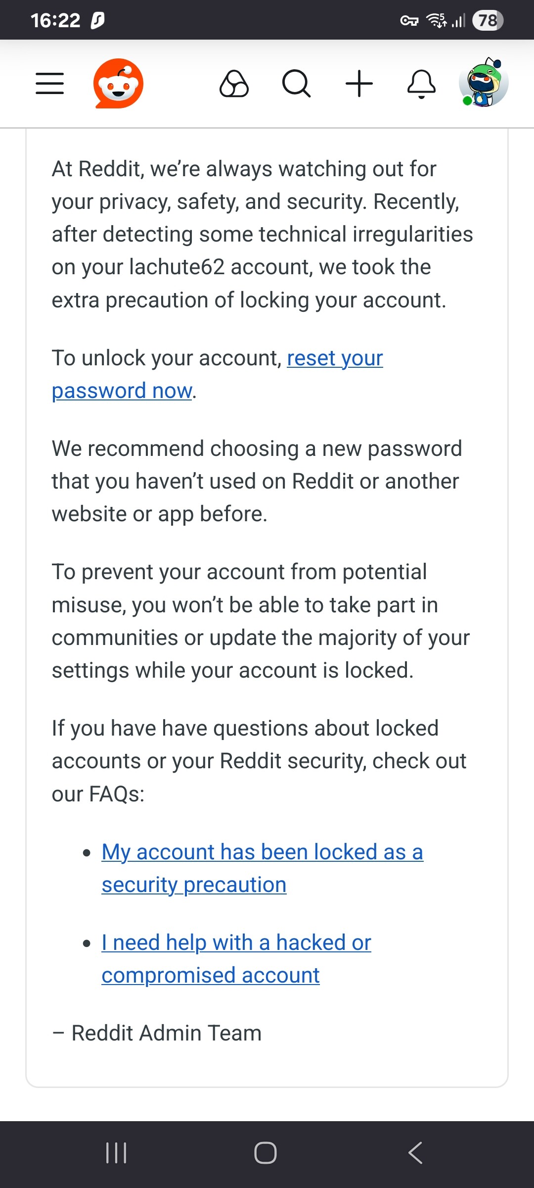 To this day, I have no idea why my Reddit account is locked, and I haven’t been able to get it re-activated. My last recourse is to create a new account to ask support about my current account. I haven’t done that yet because I’m lazy, but it’s frustrating not to be able to follow any new sub or even upvote or comment on a post. It’s extremely frustrating.