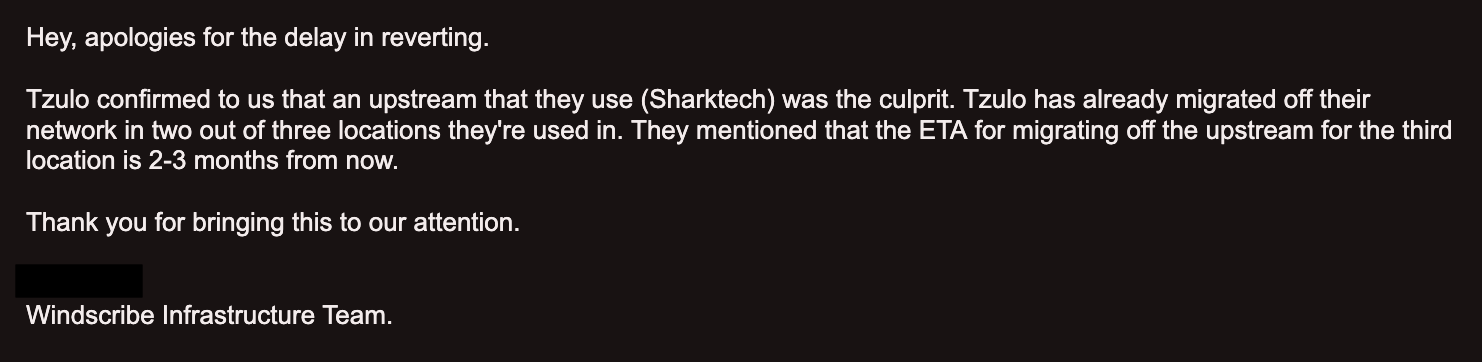 I ended up reaching out to them in March last year regarding this. The only provider that did care was Windscribe, which ran an investigation and found out that Tzulo was indeed sharing data with Team Cymru through their upstream provider Sharktech. I’ve posted their raw response to me on twitter: https://x.com/beescoitu/status/2035237706394145151.