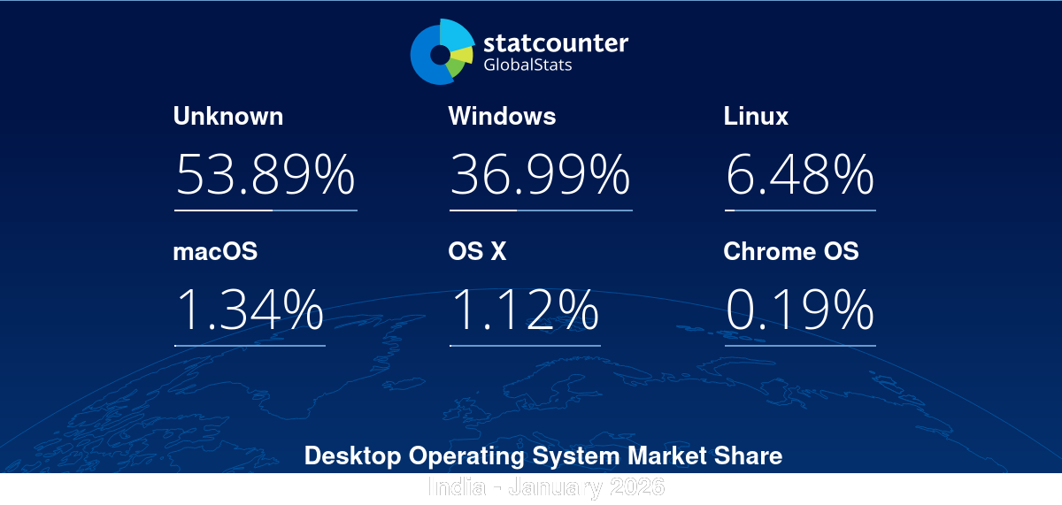 Every StatCounter stat about desktop OS market share has a small portion of “Unknown”, but for India, this portion is the majority. It makes me wonder, because how can such a majority statistic be unknown? And what if it’s mostly Linux like what Steven from ZDNET argued about the U.S. desktop market share statistics [Source]?