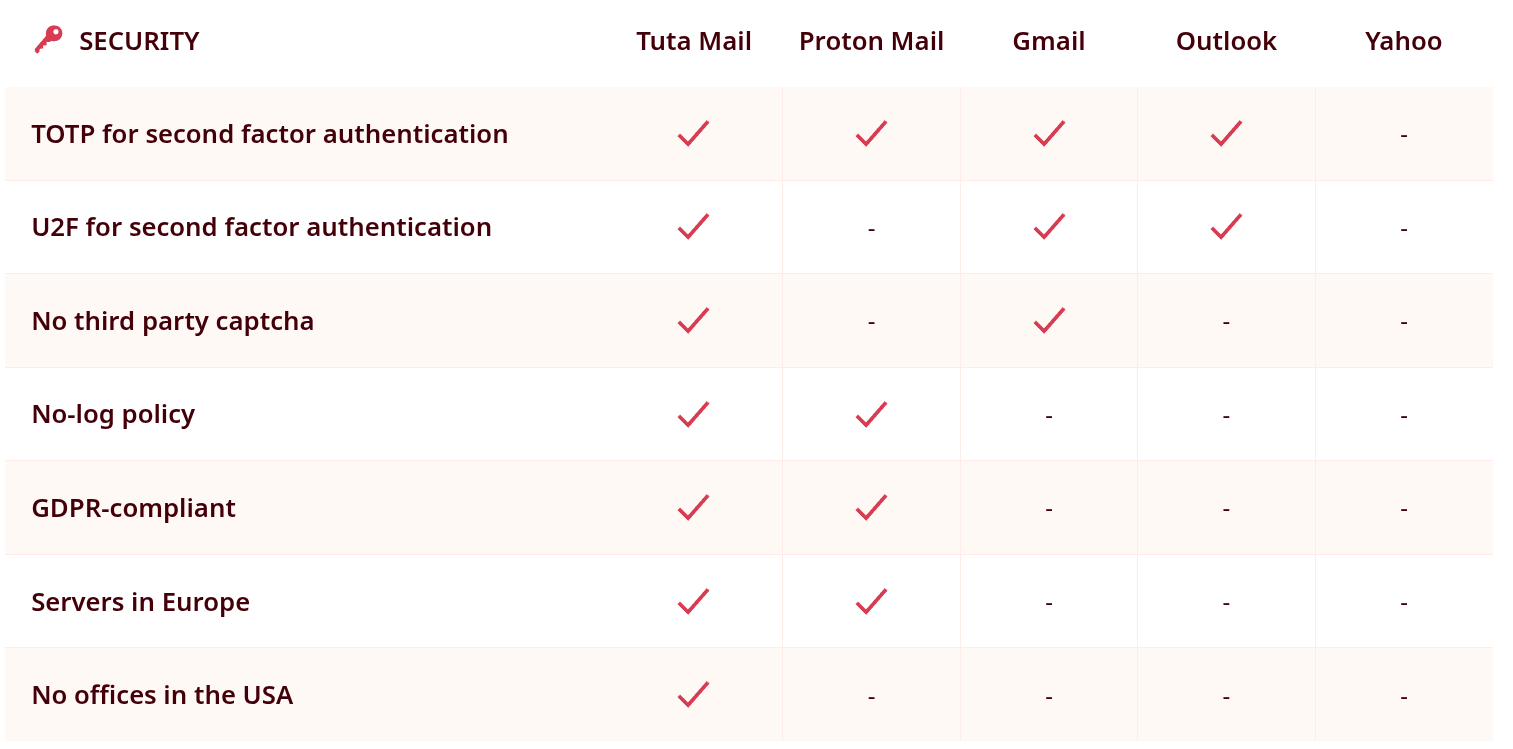 According to Tutaâs email service compassion theyâre the most secure one. Partly because they have âServers in Europeâ and âNo offices in the USAâ.