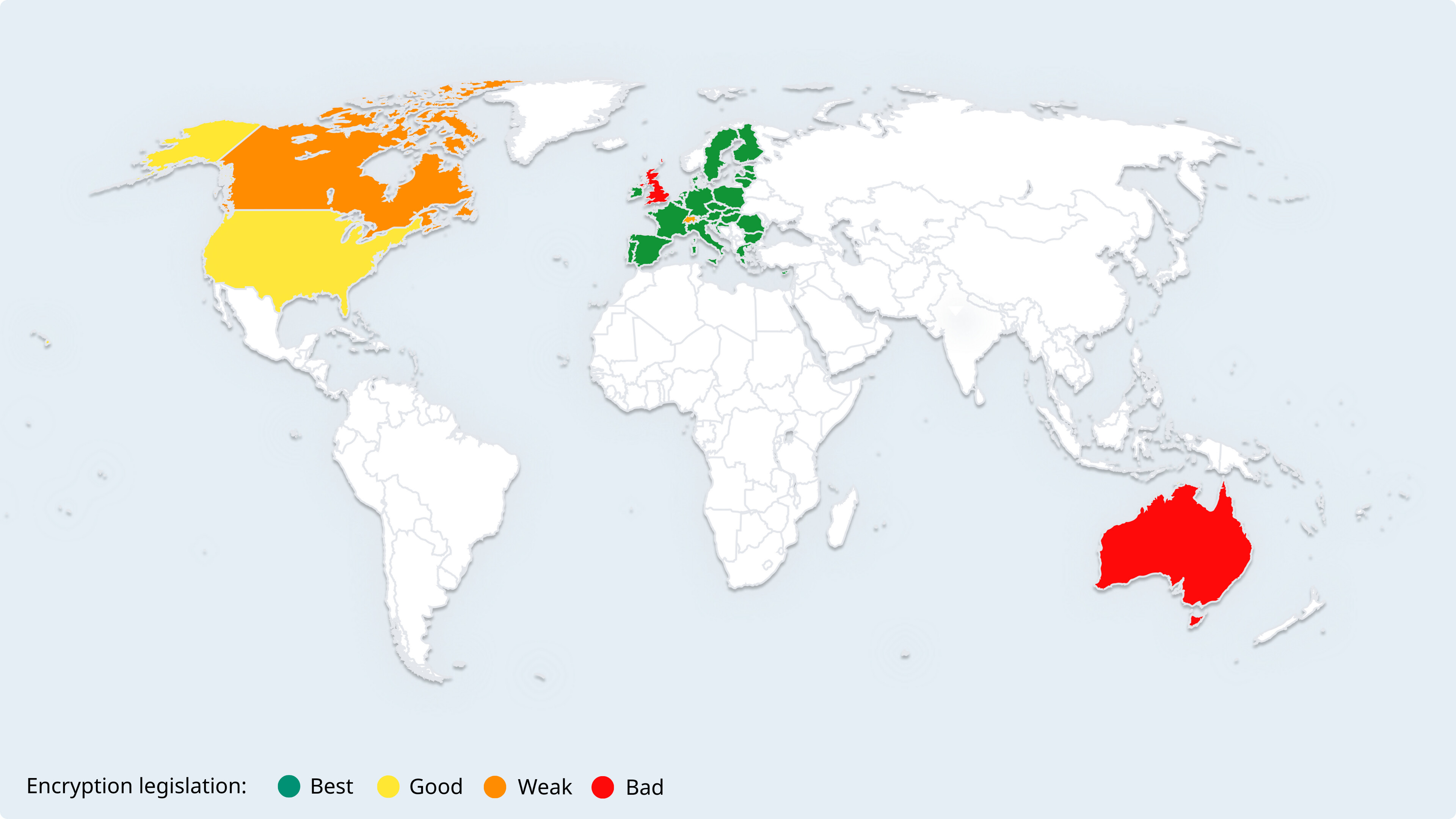 Same in the US, which they have marked yellow. âIn the USA, end-to-end encryption can (not yet) be legally broken, however, laws like the CLOUD Act and FISA give the authorities excessive rights for data requests to American tech providers, sometimes even without a court order.â Ok so in other words, no encryption backdoors, the government can just request data that the companies already have.