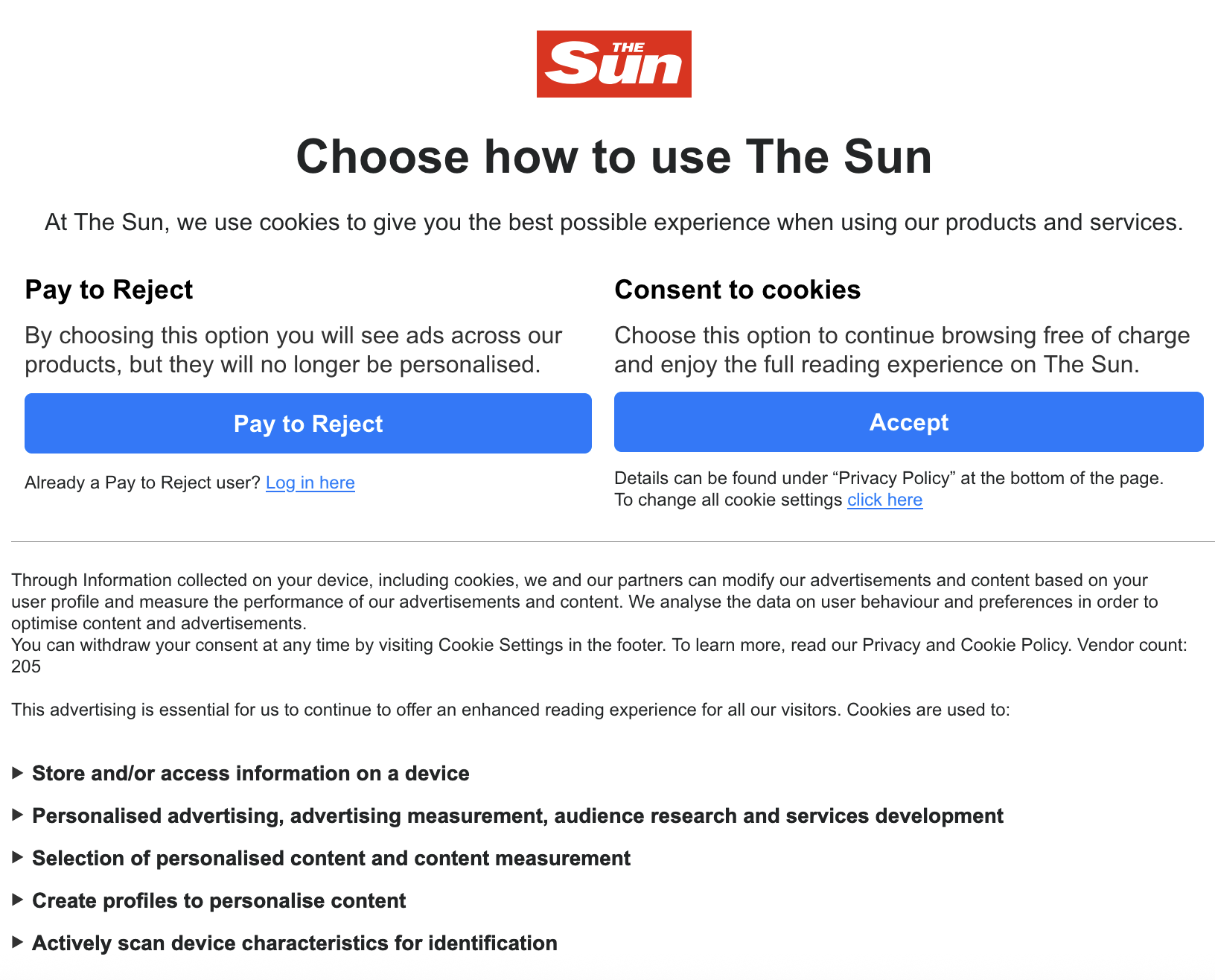 I use Arkenfox (hardened Firefox) with uBlock Origin in ‘Hard Mode’. Browsing to “The Sun”, I see no cookie notice. I do not know which part is neutering the cookie notices, but I rarely if ever see them anywhere.