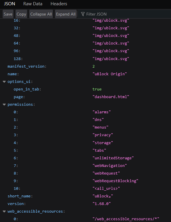 … is not fine-grained enough to determine its fingerprintability. You therefore need to look at the source code of the extension. (You can do so by following the steps here.) Within the source code is a file called manifest.json which lists all resources and permissions of the extension, like so…