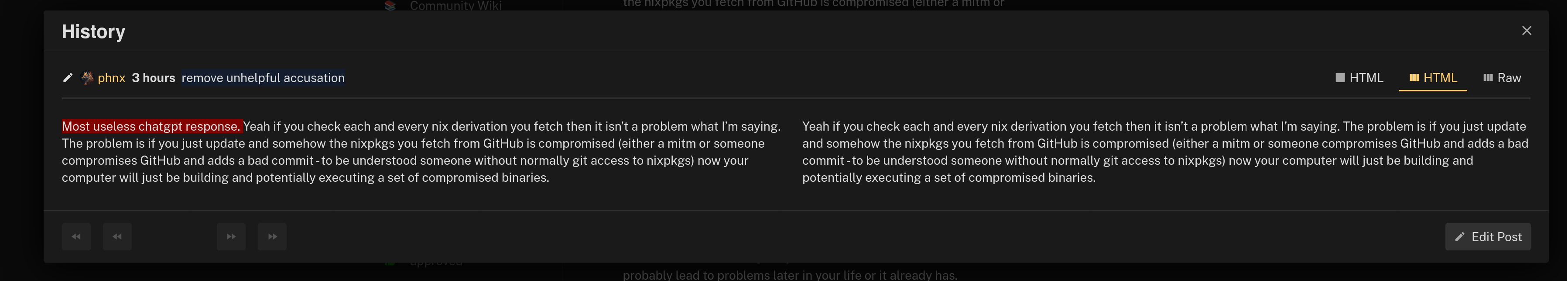 I’ve basically been following #32957 on here and one person started sending links to archive today to prove what the other person said beforehand as it made them “look like a maniac” in their own words. Personally I’m a strong fan of being able to see the message history like you can on Signal. I never really thought about this until just know but sometimes I already had a feeling that edits on here were not small edits but major things.
