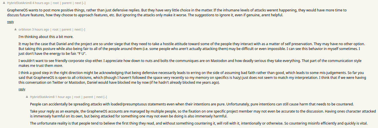 - This thread has been posted on Hacker News where many of the usual suspects are attacking GrapheneOS and our team with fabrications. These attacks should be opposed instead of letting a vocal minority dominate the narrative by investing substantial time in lying about GrapheneOS.