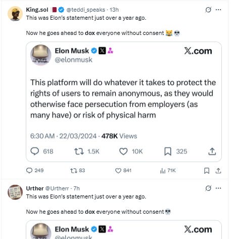 What X is doing isn’t doxing. A Conservative influencer asked Elon to show the location of accounts on X, saying that foreigners are destroying the US through social media. X told the influencer to give them 72 hours and it would be done.
